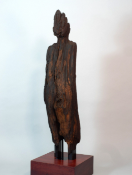 中之坊にはかねてより焼損による損傷で像容不明の木造が伝わっています。足も破損して立つことができず、これまでは寝かして安置しておりました。何度か、霊宝殿にて公開させていただいた時も展示ケースに寝かせての公開でした。長年「なんとか立ってお祀りすることはできないものか」と願っておりましたが、奈良大学・山田修先生の監修のもと、仏像修復家の宮木菜月氏に修復していただくこととなり、昨年、修復が完了し、立ってお祀りすることができるようになりました。これまで寝かせた状態では全く気づくことができなかった、たいへん美しい立ち姿があらわれました。