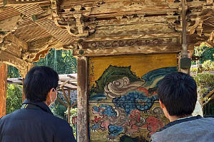 これまで誰も見たことのないもので、背面には鮮やかな霊鳥。左右両側の側面には唐獅子が描かれていました。正面の向拝の下部にも絵が隠れており、梅の絵があらわれました。