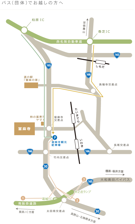 バスは必ず地図上の當麻観光Pに駐車してください。