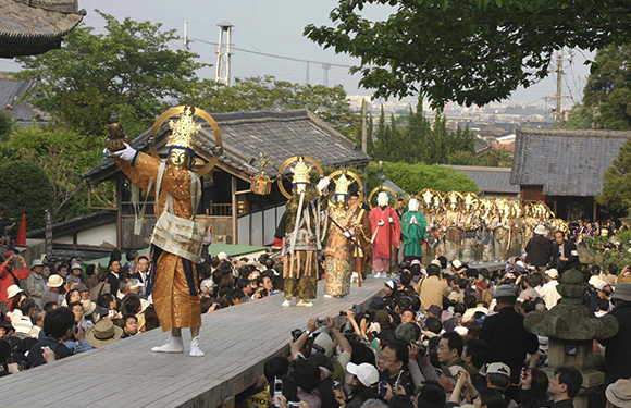 境内に来迎橋がかけられ、観音菩薩、勢至菩薩ら二十五菩薩が、現世に里帰りした中将姫を迎えて、阿弥陀さまの待つ極楽へ導いていく様子を再現します。