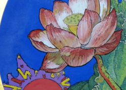 アフレスコ画の第一人者で、日本を代表する芸術家である絹谷画伯特有の感性で、みほとけを象徴する蓮の花に太陽と月を配しておられます。