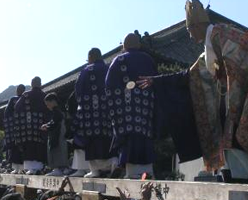会式の進行はまず、極楽浄土におられる中将姫さまがいったん現世に戻っていただくために、曼荼羅堂から娑婆堂へ中将姫像が移されます。その後、導師と僧侶が道中を清めながら、中之坊から曼荼羅堂へ上ります。僧侶が極楽の聖衆として花筵場(かえんば)に着座しましたら、いよいよ二十五菩薩が中将姫さまをお迎えに、極楽(曼荼羅堂)から現世(娑婆堂)へ次々と来迎されます。