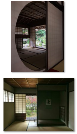 中之坊書院には、片桐石州作とされる茶室が二席設けられており、そのうち「丸窓席」の円窓から庭園を眺めていただきました。