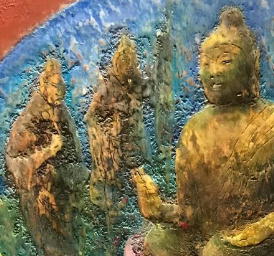 絵の具に砂を混ぜて下地を作るなどの弓手氏の独特の技法は「全ては土から生じる」という考えから来ているそうで、この考え方は「阿字(「地・水・火・風・空」のうち「地」)から全てが生じる」という真言密教の考えに通じるものがあり、また、當麻寺金堂の弥勒佛坐像が塑像(土製の像)であり、當麻寺の創建時より同じ場所に座し続けておられることにも重なり、たいへん感慨深いものがあります。